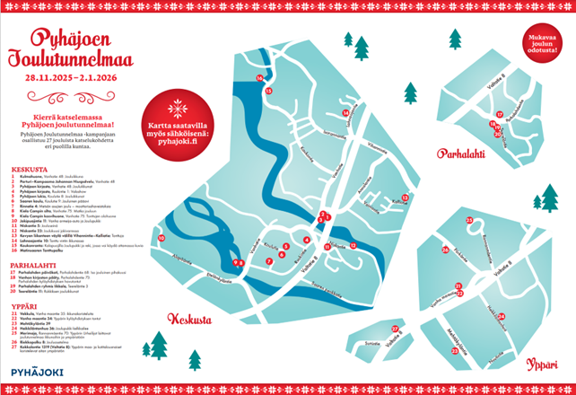 Pyhäjokiset ovat jälleen koristelleet jouluisiksi portinpieliä, ikkunoita, joulukuusia ja jopa vanhan sotilasajoneuvon. Koristeltuja kohteita voi tutkia kartasta, joka löytyy Pyhäjoen kunnan verkkosivuilta, Pyhäjoen Kuulumiset -lehdestä sekä paperiversiona Pyhäjoen kirjastolta.