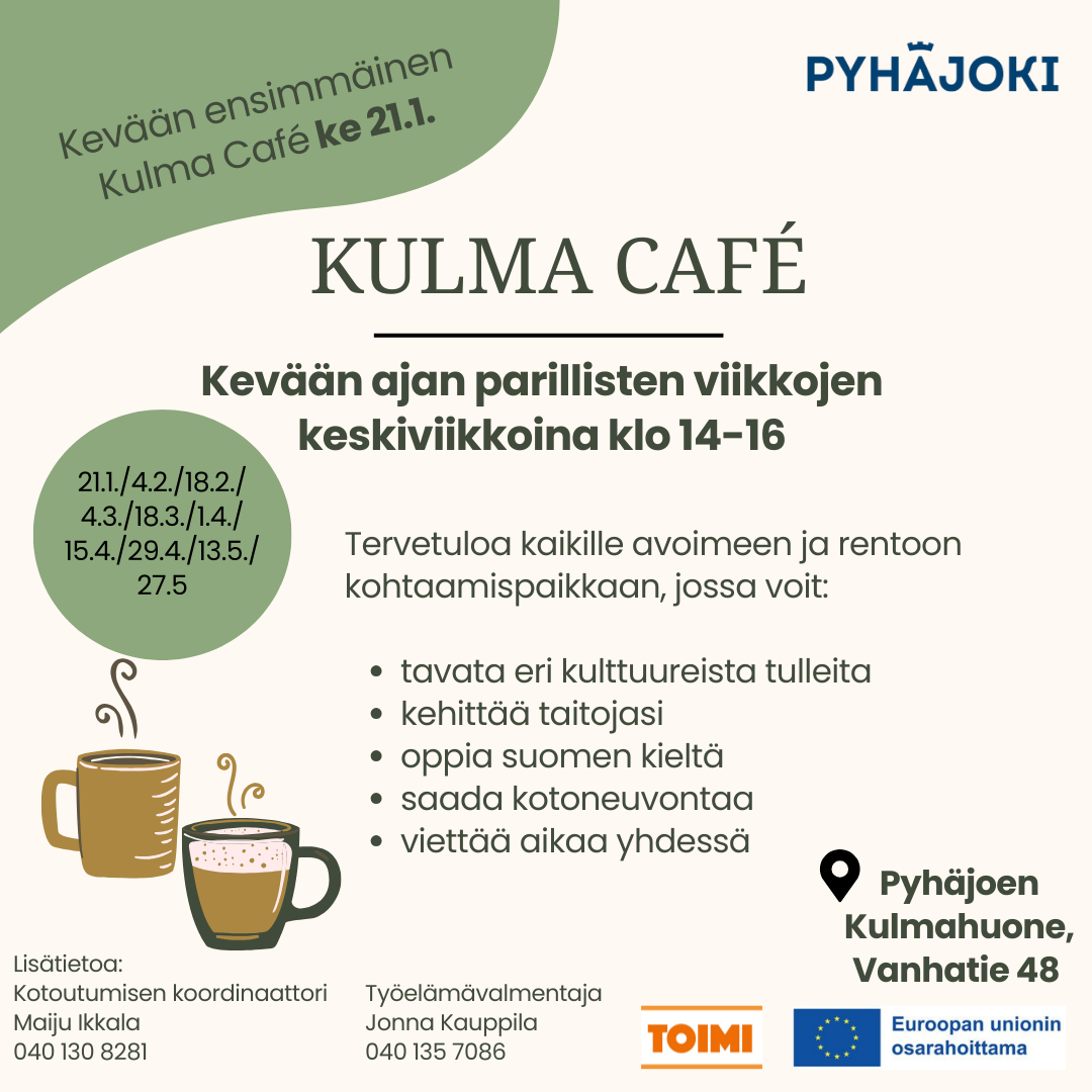 Pyhäjoella tapahtuu KoulutusKoulutus Kulmahuoneella: CANVA-ohjelman perusteet14.04.2026 - 09:00 Pyhäjoen Kulmahuone, Vanhatie 48 Muut tapahtumatKirjailijavieras Jenna Kostet14.04.2026 - 18:00 Pyhäjoen kirjasto, Vanhatie 48, 86100 Pyhäjoki Muut tapahtumatKulma Café Kulmahuoneella15.04.2026 - 14:00 Kulmahuone, Vanhatie 48 YritystapahtumatMinustako yrittäjä? -tilaisuus Pyhäjoella16.04.2026 - 17:00 Kulmahuone, Vanhatie 48 Tapahtumakalenteri